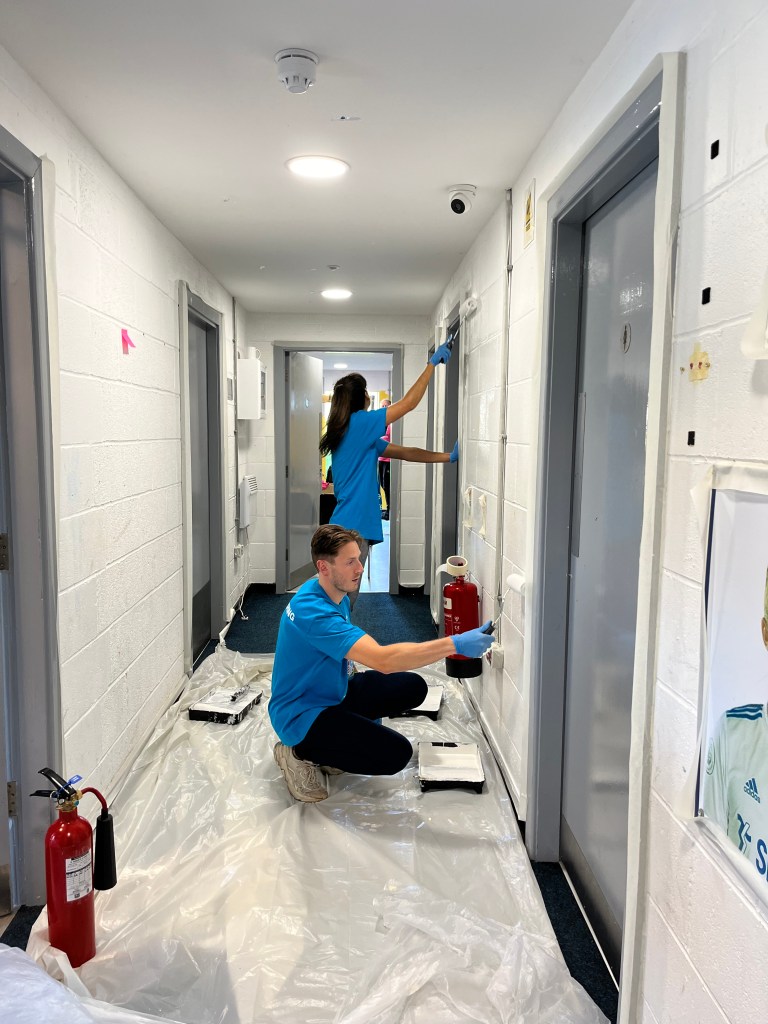 Over the day, the group redecorated the Football changing rooms (also used for other activities), the hallway and both toilets. The challenge was to create feature walls with borders of black and white, with a central yellow area to match the logo and football colours and give the white walls a freshen up.